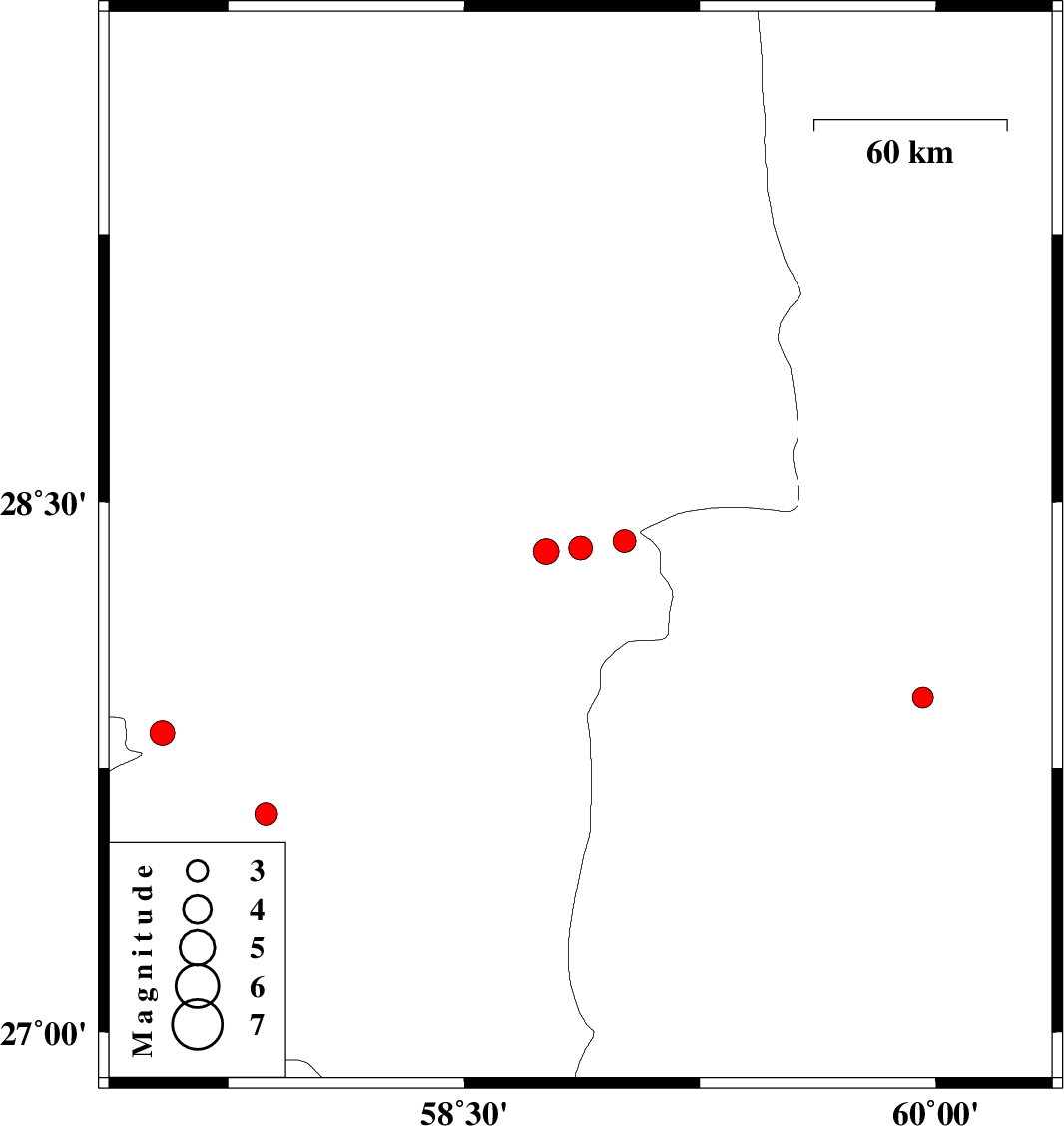 | 2011/05/06 | 15:28:11.1 | 19:58:11.1 | 27.95 | 59.96 | 17 | ML:3 | Sistan va Baloochestan Province, 109 km North-West of Iranshahr |