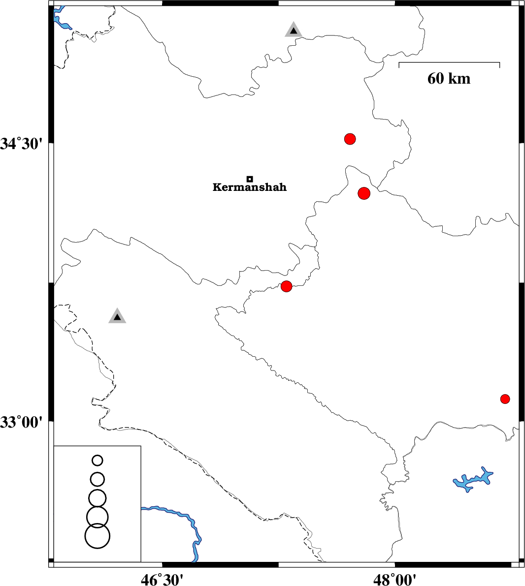 2011/05/30 | 20:19:11.1 | 00:49:11.1 | 34.23 | 47.8 | 18 | ML:3.5 | Lorestan Province, 22 km East of Harsin | ||