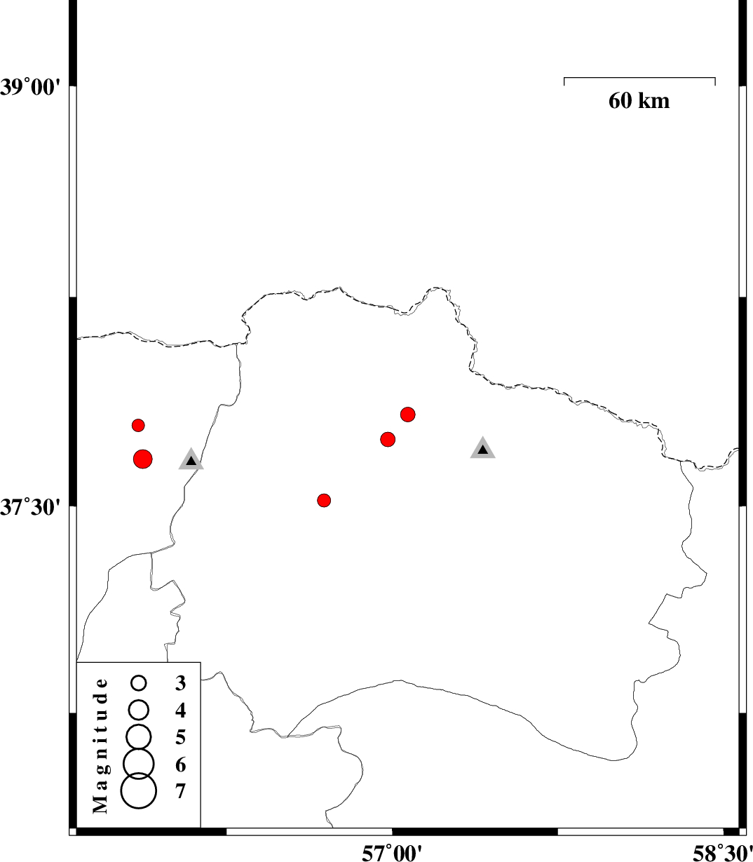 | 2011/06/04 | 21:45:54.2 | 02:15:54.2 | 37.83 | 57.07 | 42 | ML:3 | Khorasan(north) Province, 33 km North-East of Ashkhaneh | ||