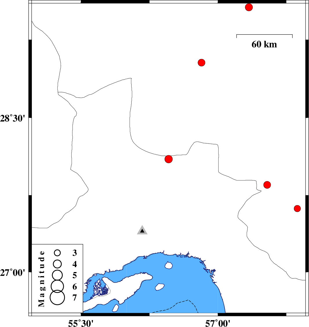 | 2011/06/07 | 01:22:49.4 | 05:52:49.4 | 28.1 | 56.46 | 17 | ML:3.8 | Hormozgan Province, 60 km South-East of Hajiabad | ||