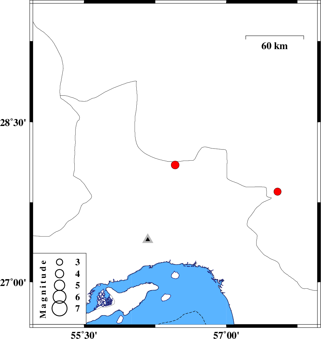 | 2011/06/07 | 01:22:49.4 | 05:52:49.4 | 28.1 | 56.46 | 17 | ML:3.8 | Hormozgan Province, 60 km South-East of Hajiabad | ||