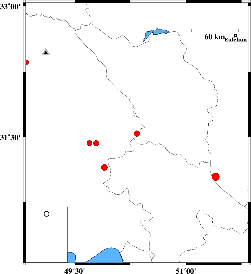 2011/05/12 | 14:25:58.3 | 18:55:58.3 | 31.04 | 51.4 | 15 | ML:4.6 | Esfahan Province, 20 km North of Sisakht |