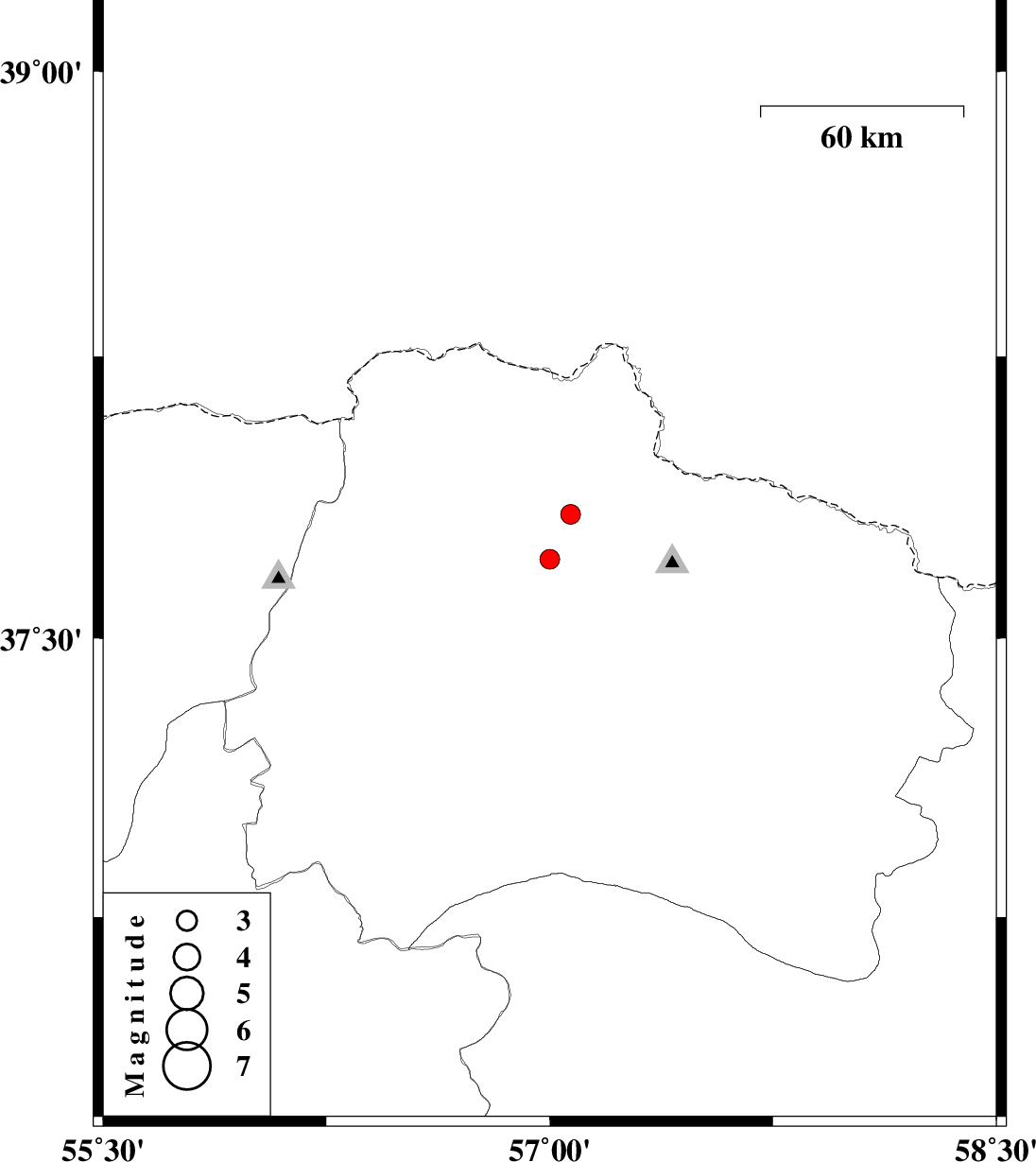 | 2011/06/04 | 21:45:54.2 | 02:15:54.2 | 37.83 | 57.07 | 42 | ML:3 | Khorasan(north) Province, 33 km North-East of Ashkhaneh |