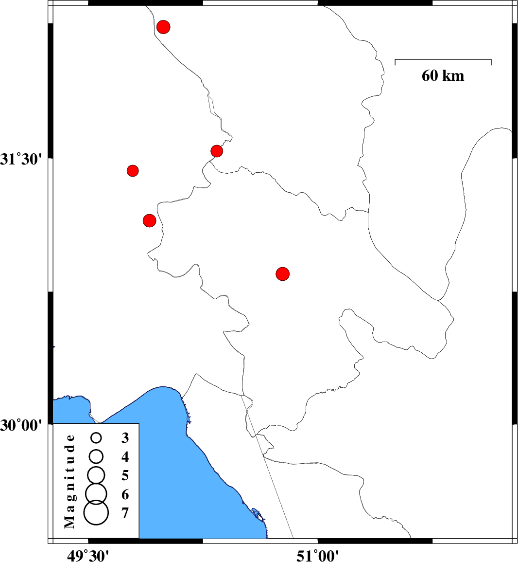 | 2011/06/08 | 09:43:42.8 | 14:13:42.8 | 31.54 | 50.34 | 15 | ML:3.5 | Khoozestan Province, 42 km East of Bagh Malek | ||
