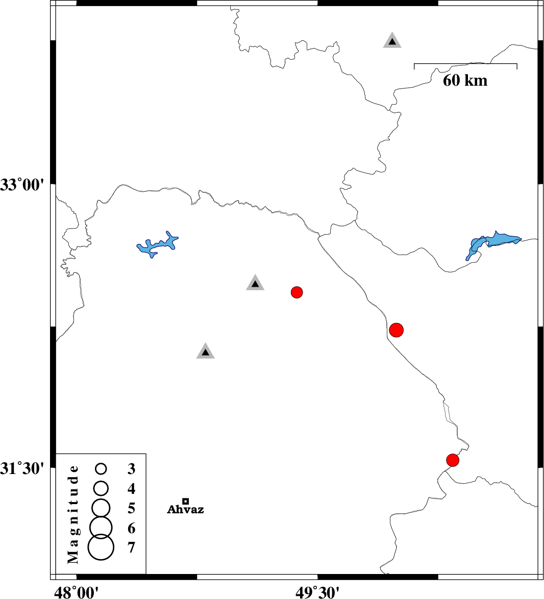 | 2011/06/12 | 04:06:26.1 | 08:36:26.1 | 32.43 | 49.37 | 15 | ML:3.2 | Khoozestan Province, 25 km East of Lali | ||
