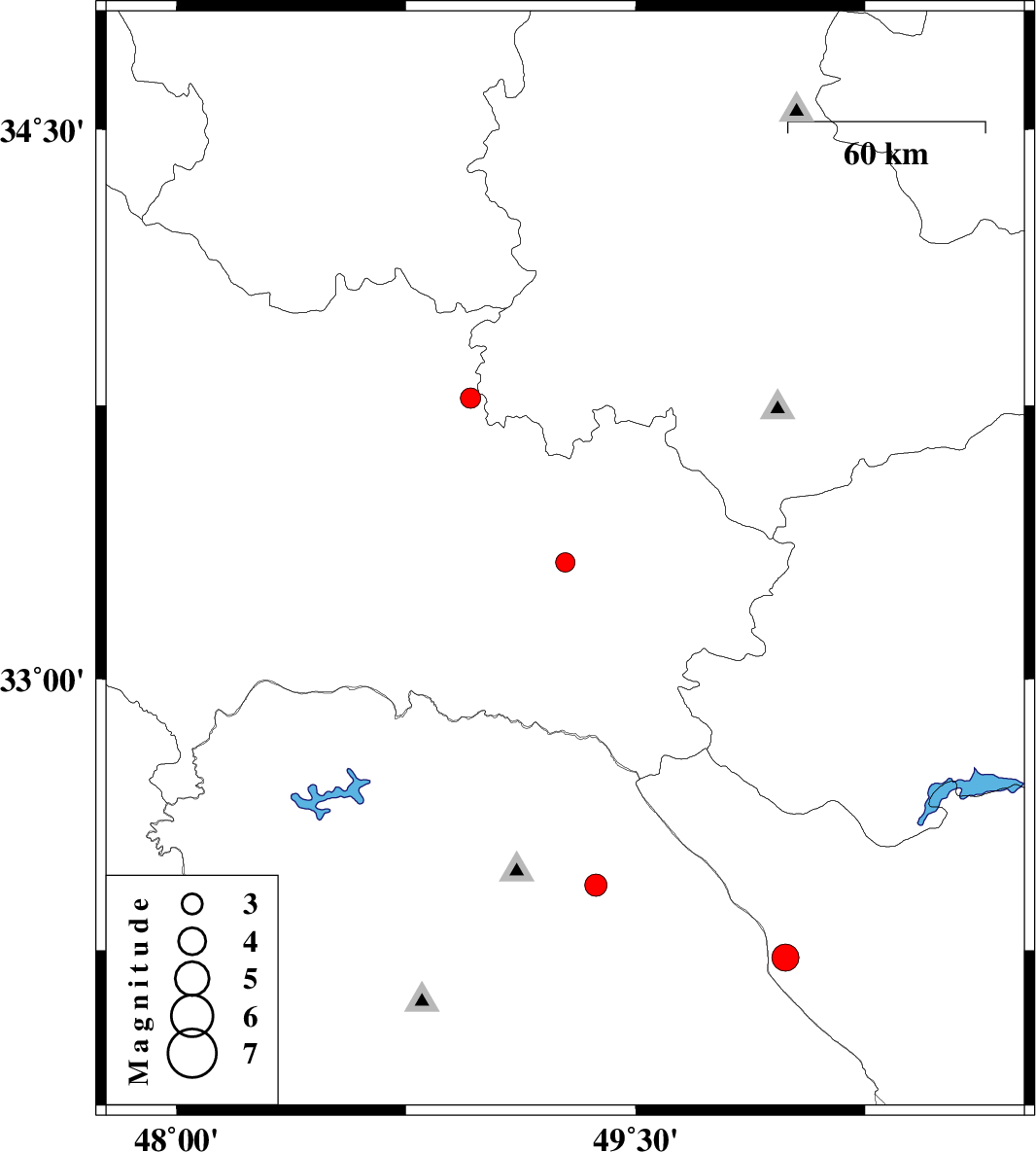 | 2011/06/13 | 10:08:12.6 | 14:38:12.6 | 33.77 | 48.96 | 15 | ML:3 | Lorestan Province, 23 km South-East of Borujerd | ||