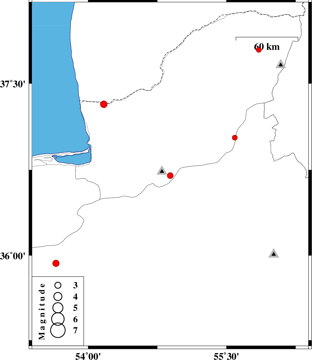 | 2011/06/16 | 07:03:19.4 | 11:33:19.4 | 36.7 | 54.89 | 15 | ML:3 | Golestan Province, 23 km South of Ali Abad | ||