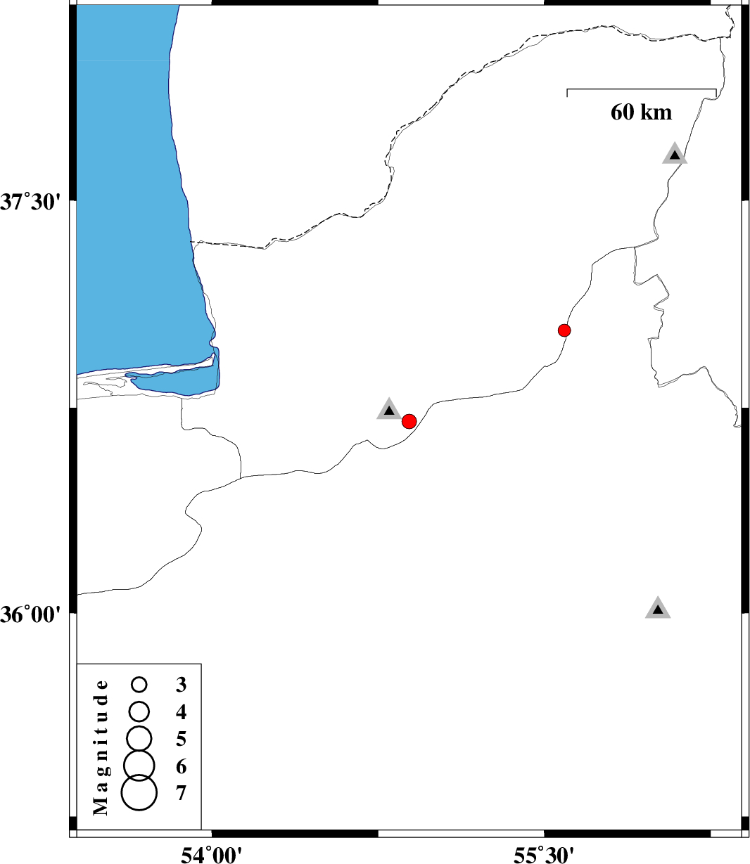 | 2011/06/16 | 07:03:19.4 | 11:33:19.4 | 36.7 | 54.89 | 15 | ML:3 | Golestan Province, 23 km South of Ali Abad | ||