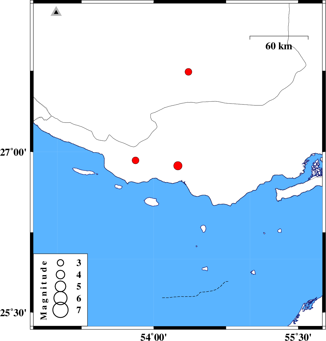 | 2011/06/17 | 05:40:16.3 | 10:10:16.3 | 26.87 | 54.25 | 46 | ML:3.9 | Hormozgan Province, 39 km South-West of Bastak | ||
