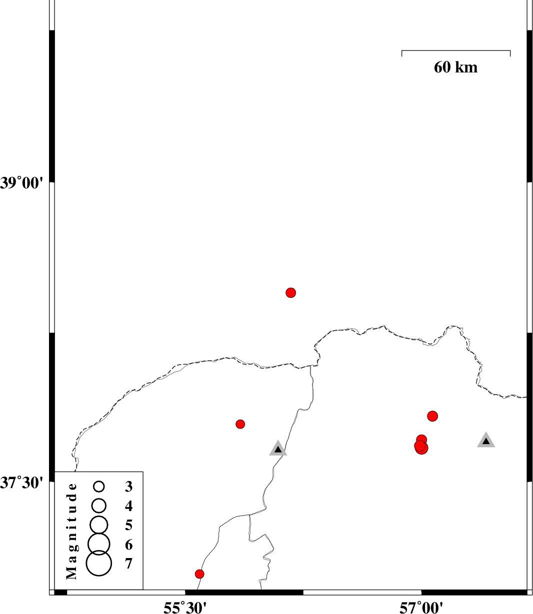 | 2011/05/27 | 20:15:24.3 | 00:45:24.3 | 37.79 | 55.85 | 20 | ML:2.5 | Golestan Province, 55 km North-East of Kalaleh |