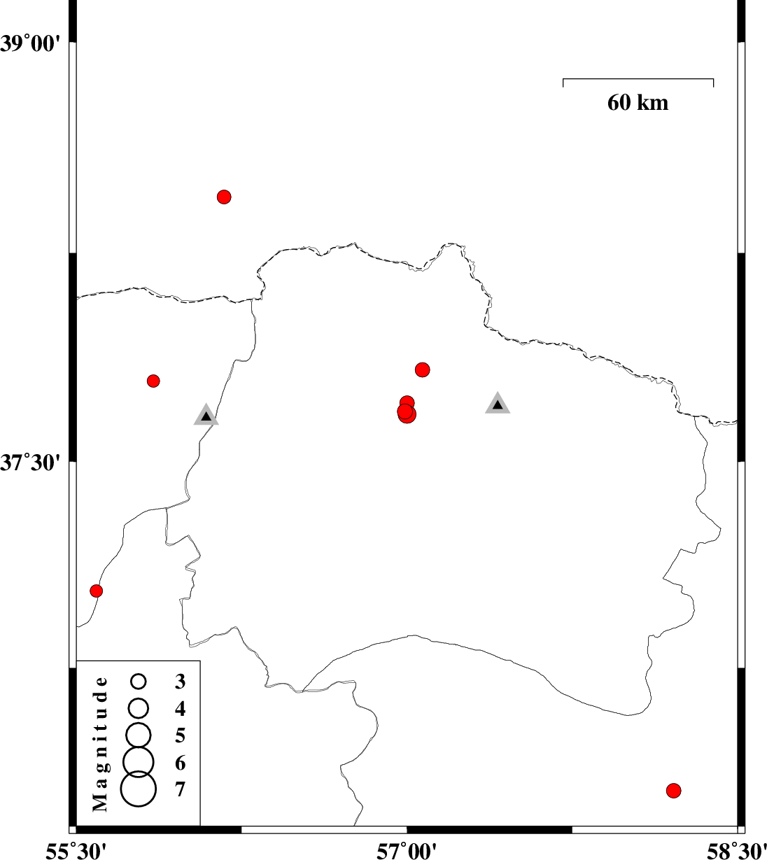 | 2011/06/04 | 21:45:54.2 | 02:15:54.2 | 37.83 | 57.07 | 42 | ML:3 | Khorasan(north) Province, 33 km North-East of Ashkhaneh | ||