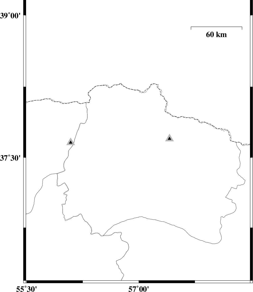 | 2011/06/10 | 02:11:19.9 | 06:41:19.9 | 37.71 | 57 | 14 | ML:3 | Khorasan(north) Province, 18 km North of Ashkhaneh | ||