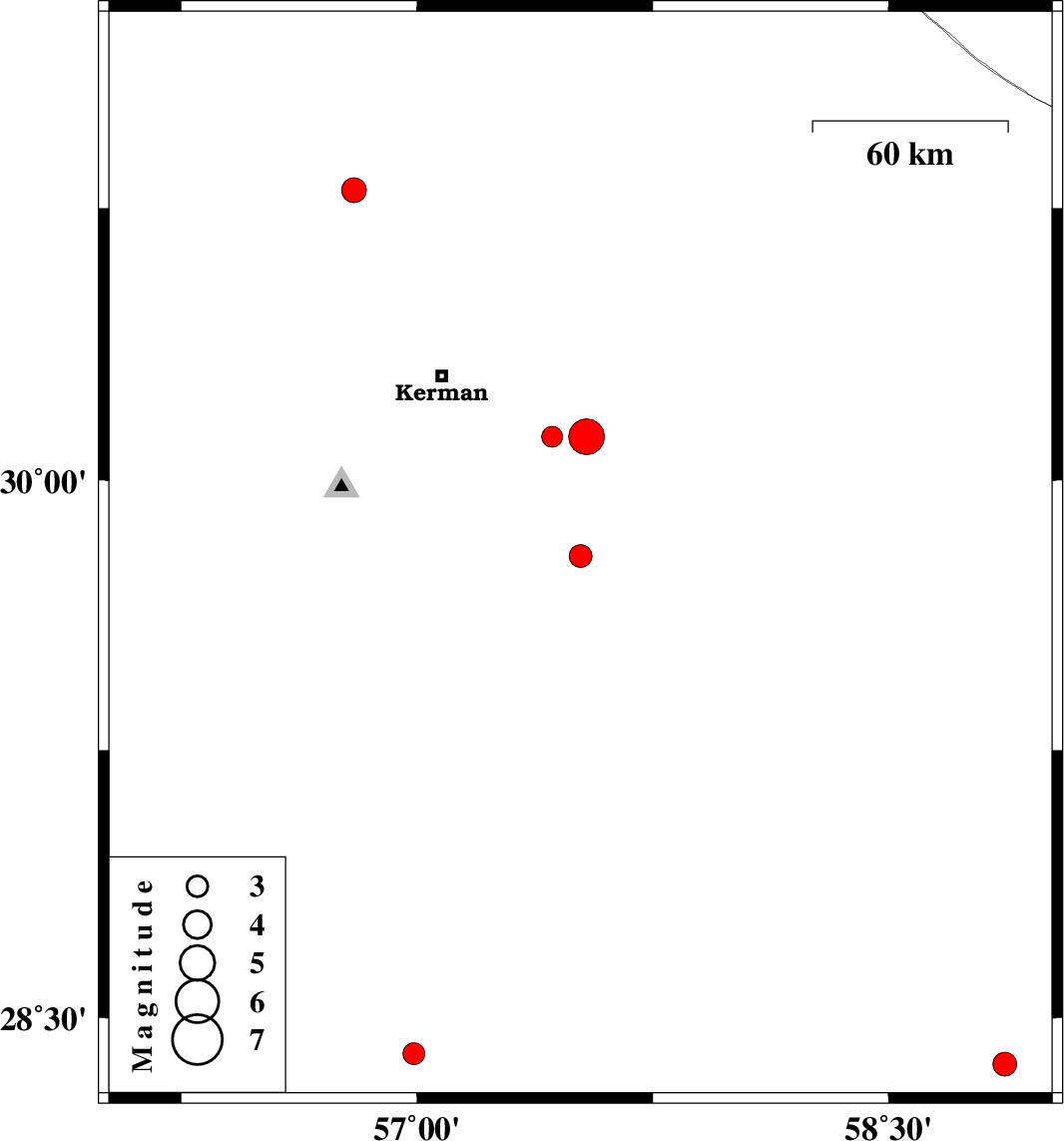 | 2011/06/26 | 09:50:28.0 | 14:20:28.0 | 29.79 | 57.52 | 9 | ML:3.3 | Kerman Province, 70 km South-East of Kerman | ||