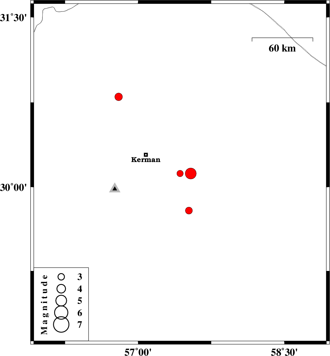 | 2011/05/31 | 01:13:24.0 | 05:43:24.0 | 30.8 | 56.8 | 9 | ML:3.5 | Kerman Province, 22 km East of Zarand |