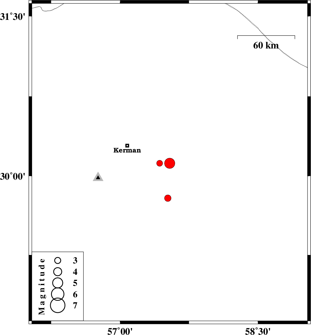 | 2011/06/26 | 09:50:28.0 | 14:20:28.0 | 29.79 | 57.52 | 9 | ML:3.3 | Kerman Province, 70 km South-East of Kerman |