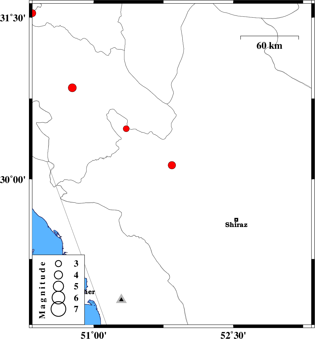 | 2011/06/08 | 09:43:42.8 | 14:13:42.8 | 31.54 | 50.34 | 15 | ML:3.5 | Khoozestan Province, 42 km East of Bagh Malek |