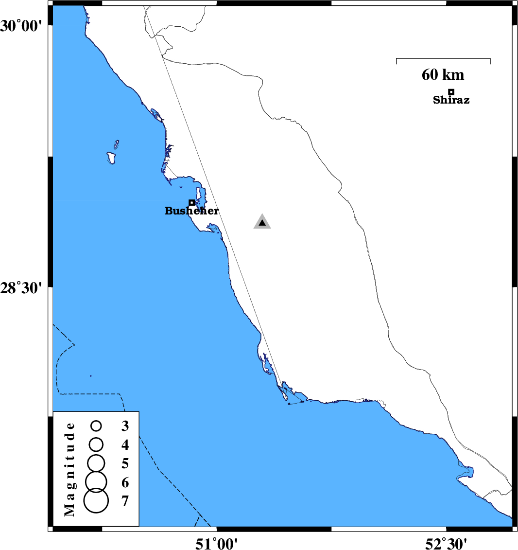| 2011/07/01 | 23:26:48.2 | 03:56:48.2 | 28.61 | 51.43 | 29 | ML:4.1 | Bushehr Province, 7 km Khormog |