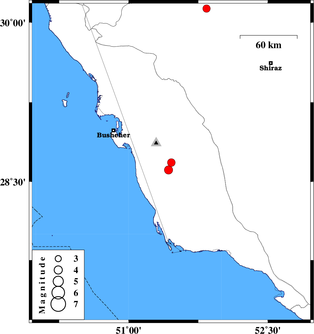 | 2011/07/02 | 01:10:40.2 | 05:40:40.2 | 28.68 | 51.46 | 30 | ML:3.8 | Bushehr Province, 9 km Khormog | ||