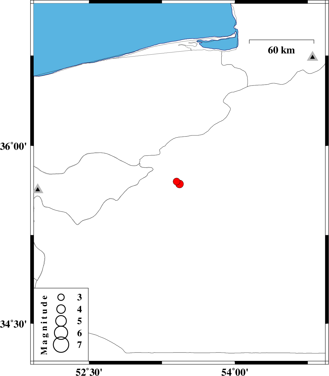 | 2011/07/03 | 19:01:23.7 | 23:31:23.7 | 35.7 | 53.4 | 6 | ML:3.3 | Semnan Province, 15 km North of Semnan | ||