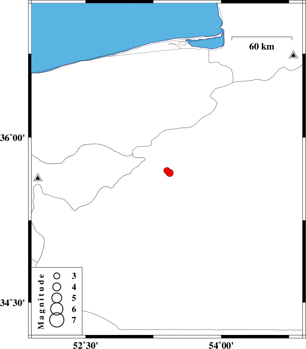 | 2011/07/03 | 19:01:23.7 | 23:31:23.7 | 35.7 | 53.4 | 6 | ML:3.3 | Semnan Province, 15 km North of Semnan | ||