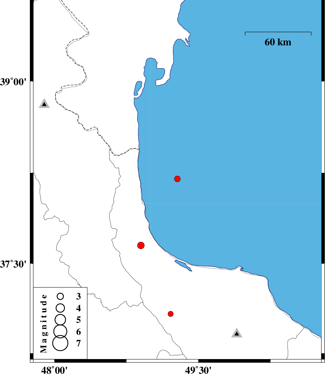 | 2011/07/09 | 00:35:08.3 | 05:05:08.3 | 38.2 | 49.28 | 25 | ML:2.8 | Caspian Sea, 44 km South-East of Astara | ||