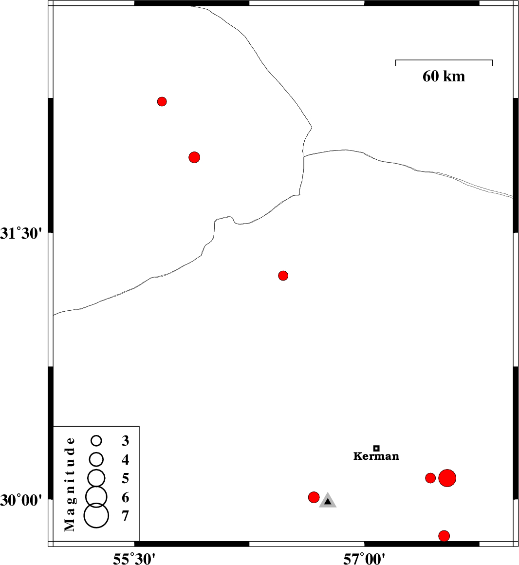 | 2011/06/26 | 09:50:28.0 | 14:20:28.0 | 29.79 | 57.52 | 9 | ML:3.3 | Kerman Province, 70 km South-East of Kerman |