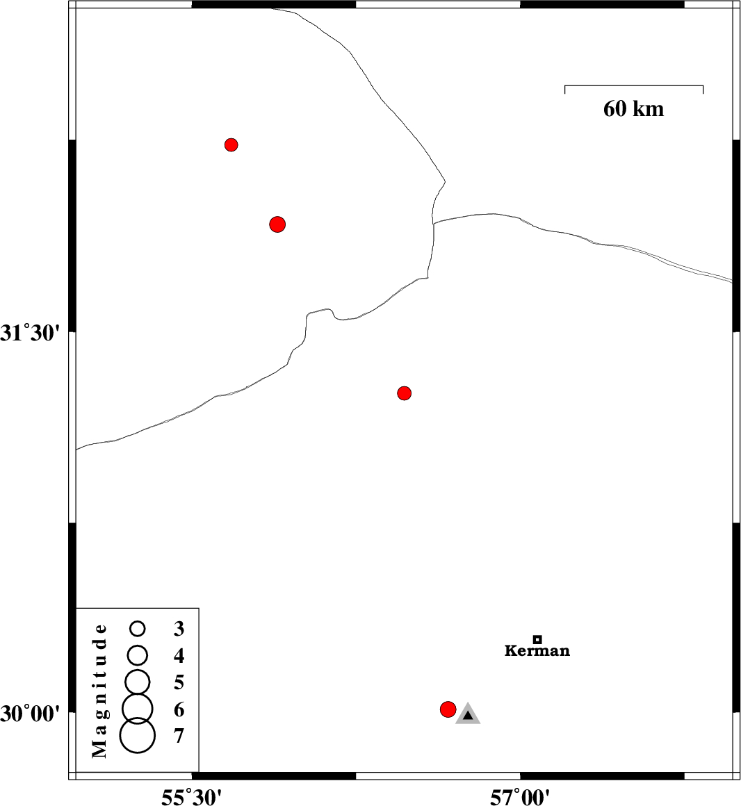 | 2011/07/09 | 06:47:39.3 | 11:17:39.3 | 30.01 | 56.67 | 26 | ML:3.3 | Kerman Province, 13 km Bardsir | ||