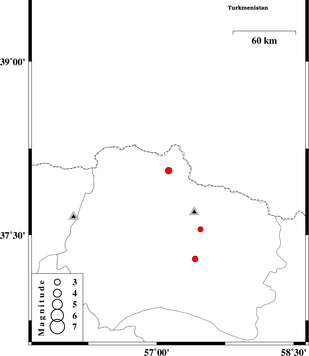 | 2011/07/09 | 11:01:34.2 | 15:31:34.2 | 37.55 | 57.48 | 46 | ML:2.7 | Khorasan(north) Province, 15 km East of Bojnurd | ||