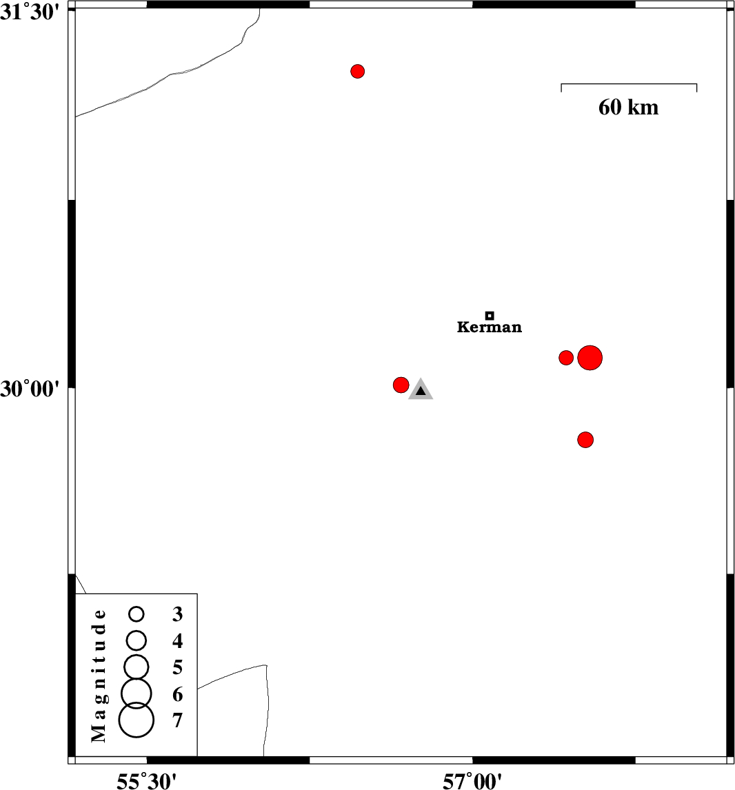 | 2011/06/26 | 09:50:28.0 | 14:20:28.0 | 29.79 | 57.52 | 9 | ML:3.3 | Kerman Province, 70 km South-East of Kerman |