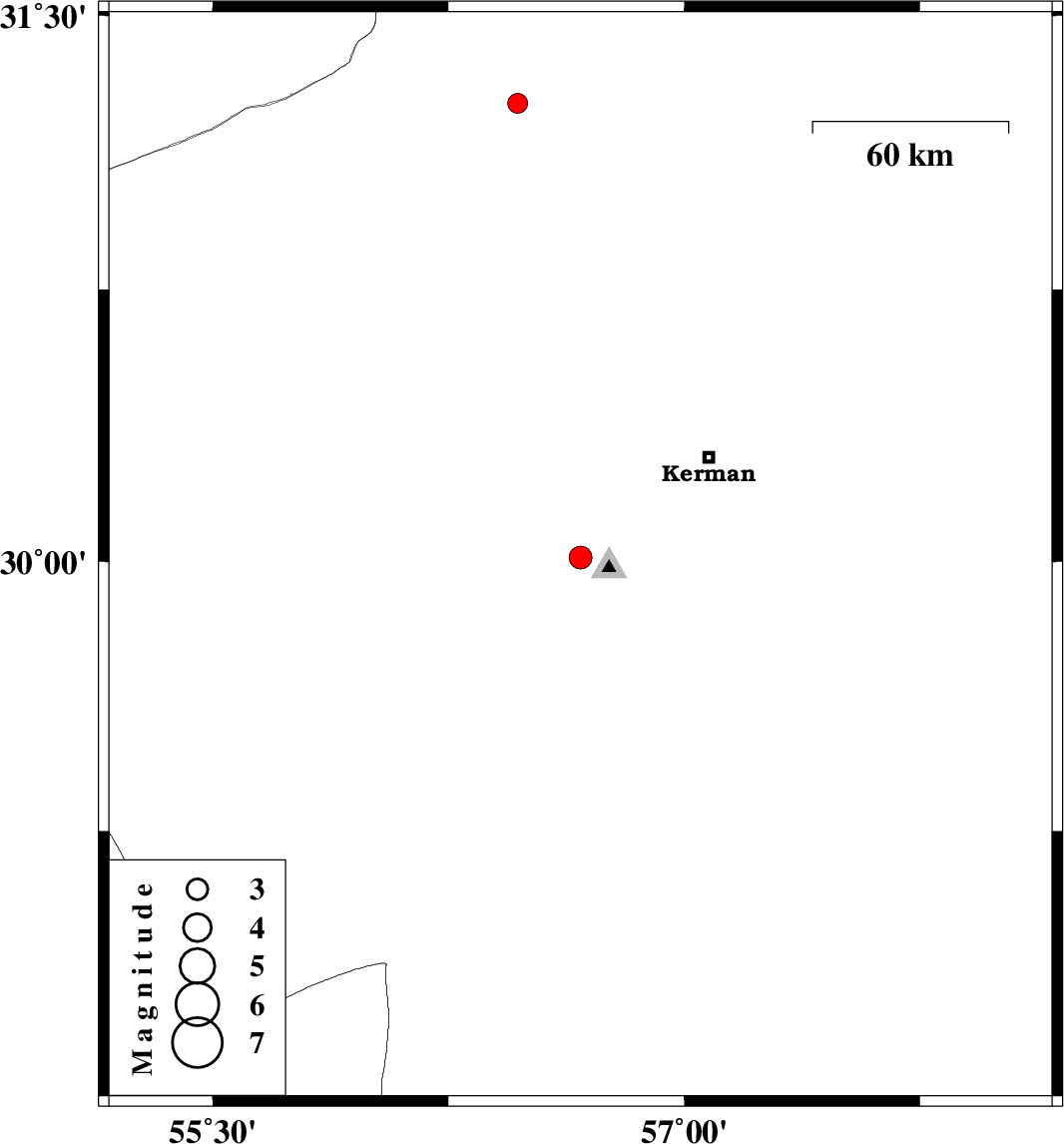| 2011/07/09 | 06:47:39.3 | 11:17:39.3 | 30.01 | 56.67 | 26 | ML:3.3 | Kerman Province, 13 km Bardsir | ||