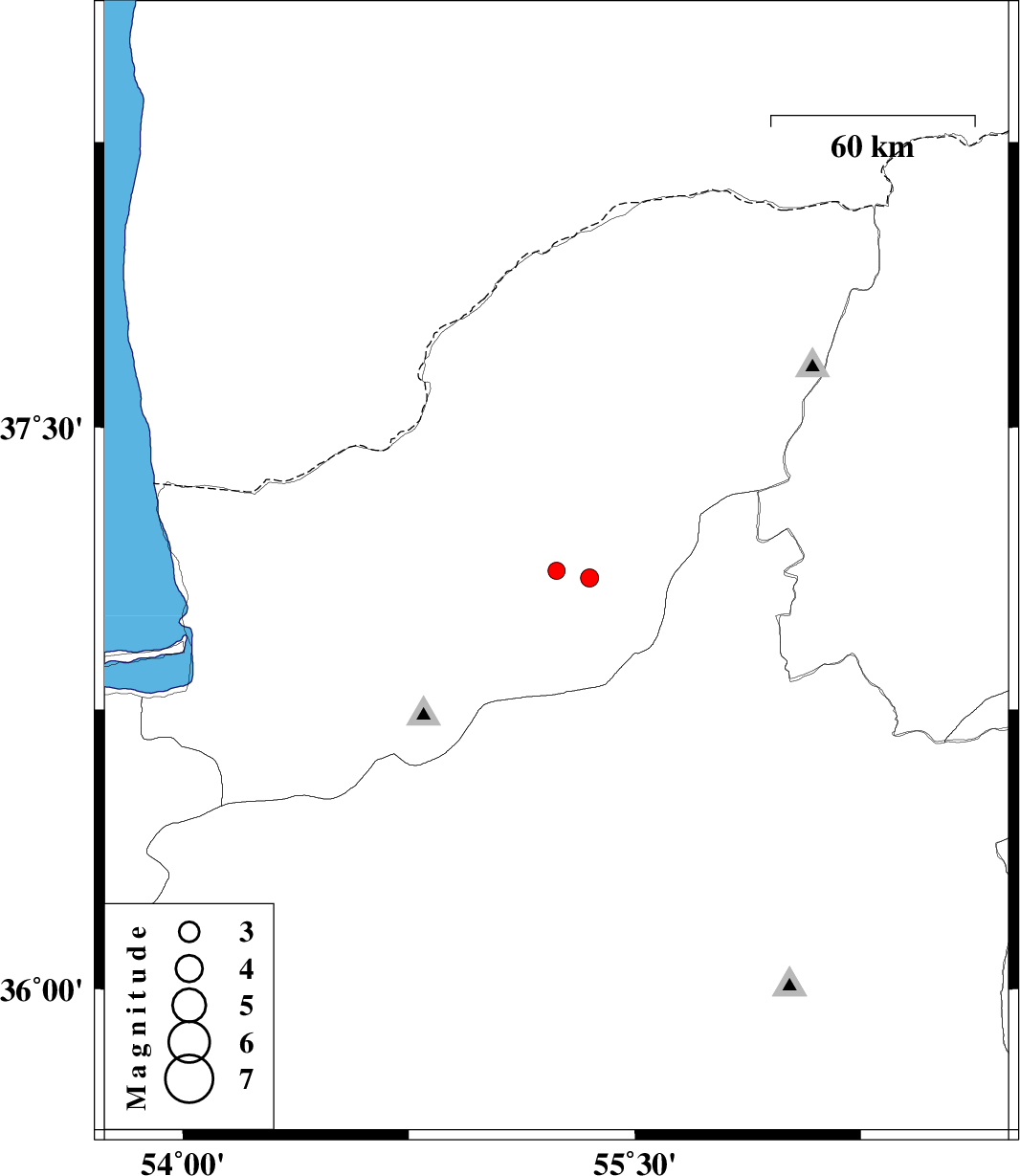 | 2011/07/09 | 03:26:53.1 | 07:56:53.1 | 37.1 | 55.35 | 15 | ML:2.7 | Golestan Province, 15 km South of Minodasht |