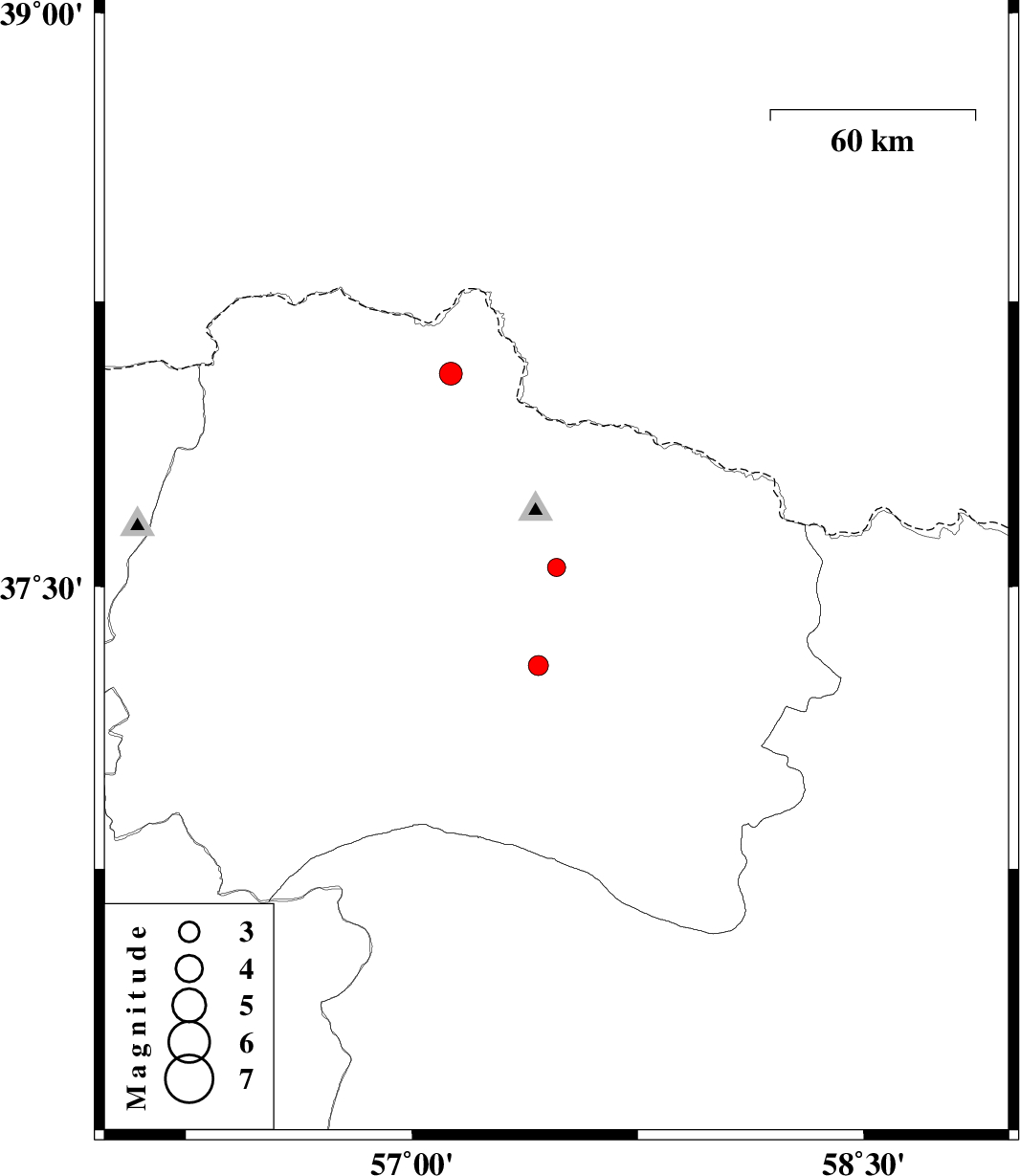 | 2011/07/09 | 11:01:34.2 | 15:31:34.2 | 37.55 | 57.48 | 46 | ML:2.7 | Khorasan(north) Province, 15 km East of Bojnurd | ||