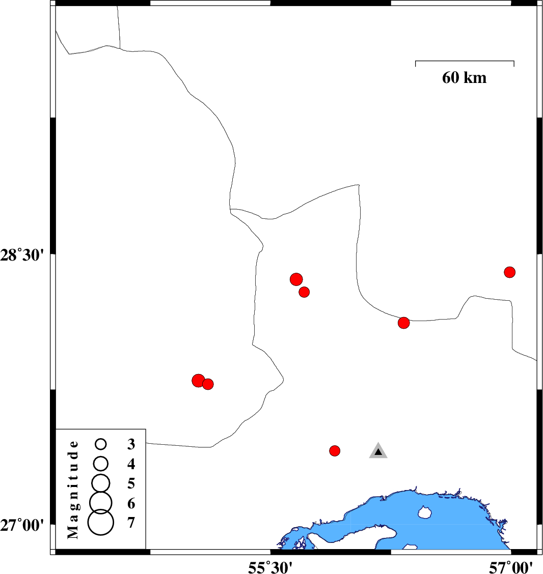| 2011/06/29 | 09:54:25.6 | 14:24:25.6 | 27.8 | 55.05 | 15 | ML:3.7 | Fars Province, 72 km North-East of Lar | ||