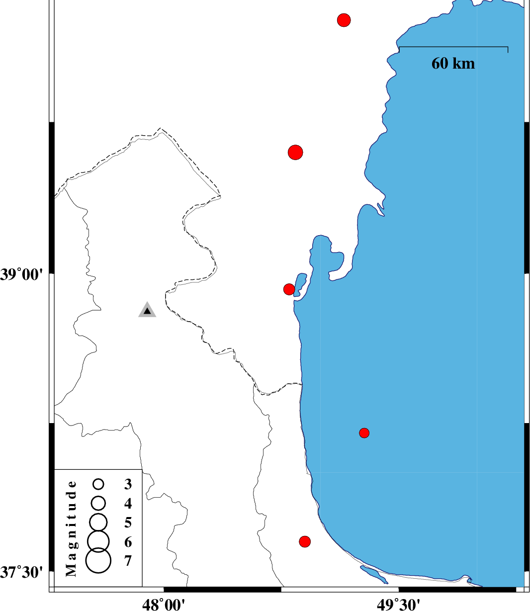 | 2011/07/09 | 00:35:08.3 | 05:05:08.3 | 38.2 | 49.28 | 25 | ML:2.8 | Caspian Sea, 44 km South-East of Astara | ||