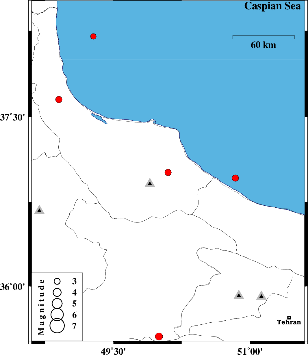 | 2011/07/08 | 07:21:27.4 | 11:51:27.4 | 36.96 | 50.84 | 7 | ML:3.3 | Caspian Sea, 17 km North of Tonekabon | ||