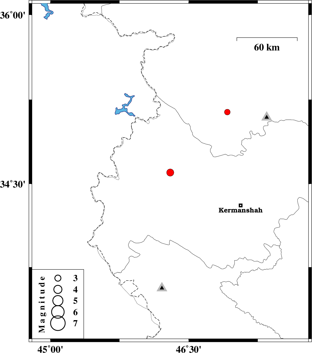 | 2011/07/14 | 20:56:51.0 | 01:26:51.0 | 34.6 | 46.3 | 7 | ML:3.5 | Kermanshah Province, 29 km South-West of Javanrud | ||