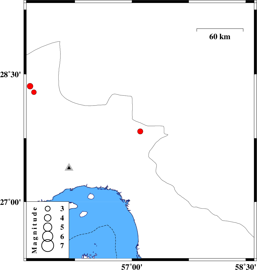 | 2011/07/10 | 06:20:01.9 | 10:50:01.9 | 28.36 | 55.66 | 18 | ML:3.5 | Hormozgan Province, 24 km West of Hajiabad |