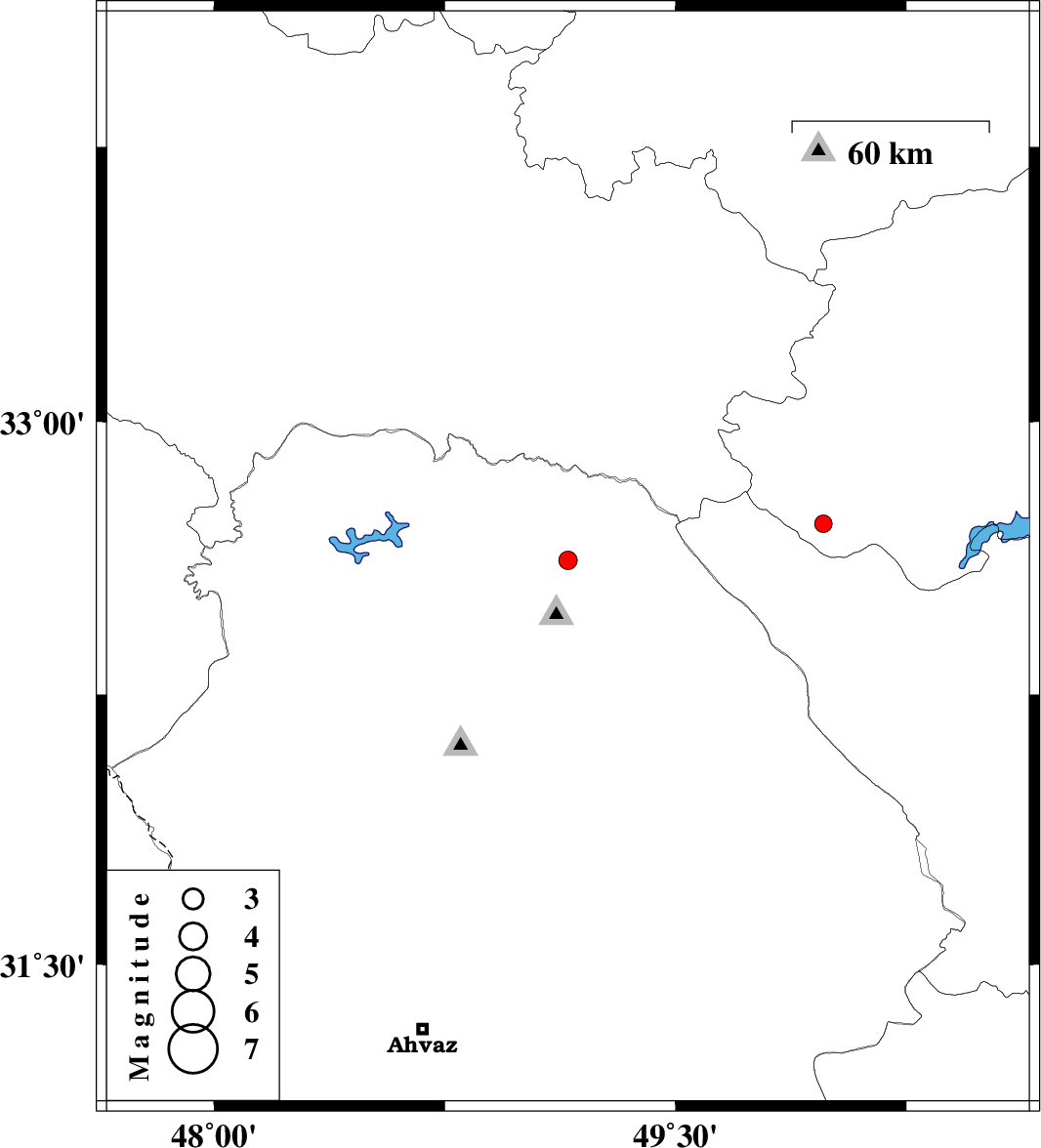 | 2011/07/23 | 14:46:20.1 | 19:16:20.1 | 32.62 | 49.15 | 14 | ML:2.7 | Khoozestan Province, 26 km North of Lali | ||