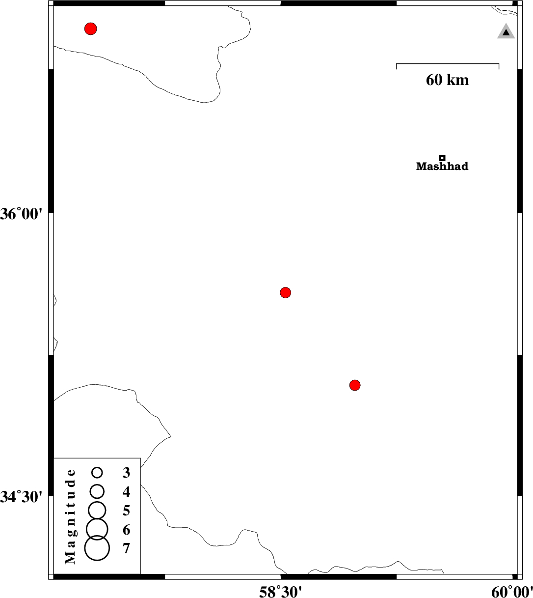 | 2011/06/28 | 02:07:51.4 | 06:37:51.4 | 36.96 | 57.27 | 14 | ML:3.5 | Khorasan(north) Province, 23 km West of Esfarayen |