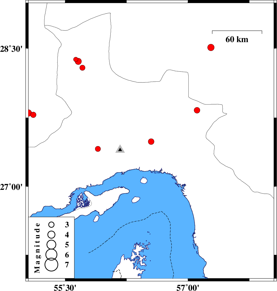 | 2011/06/29 | 10:20:51.4 | 14:50:51.4 | 27.78 | 55.11 | 15 | ML:3.1 | Fars Province, 76 km North-East of Lar | ||