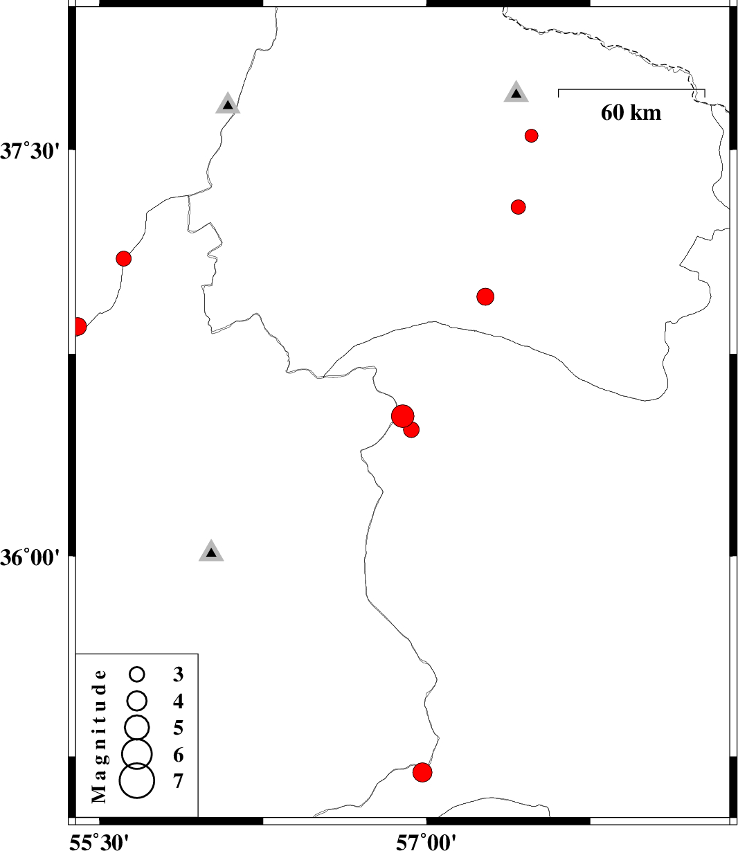| 2011/06/28 | 02:07:51.4 | 06:37:51.4 | 36.96 | 57.27 | 14 | ML:3.5 | Khorasan(north) Province, 23 km West of Esfarayen |