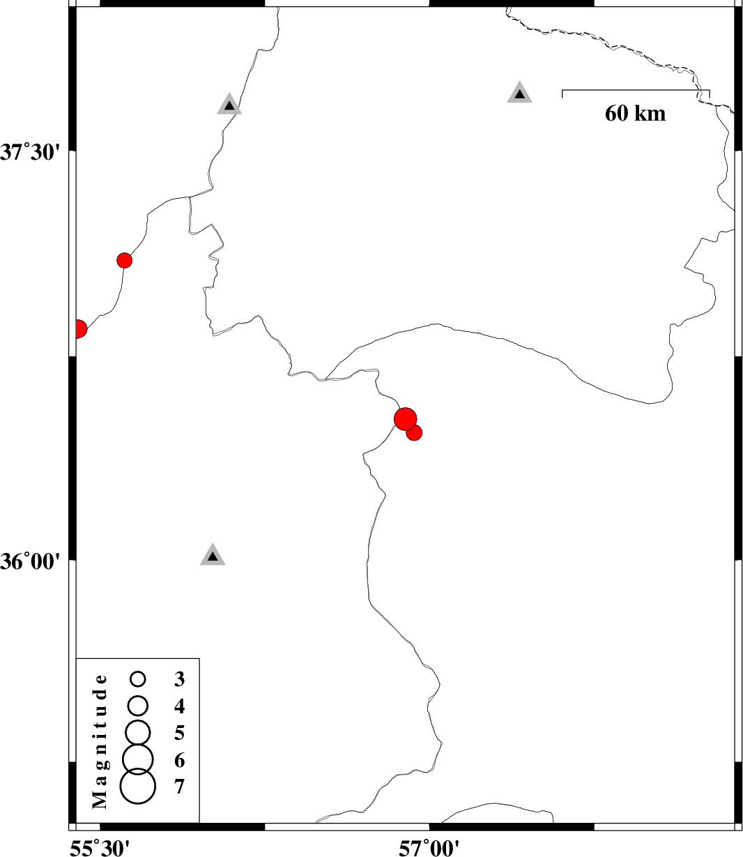 | 2011/07/26 | 04:04:10.7 | 08:34:10.7 | 36.52 | 56.89 | 6 | ML:4.7 | Khorasan(center) Province, 66 km South-East of Jajarm | ||