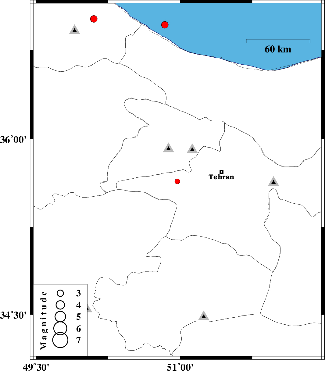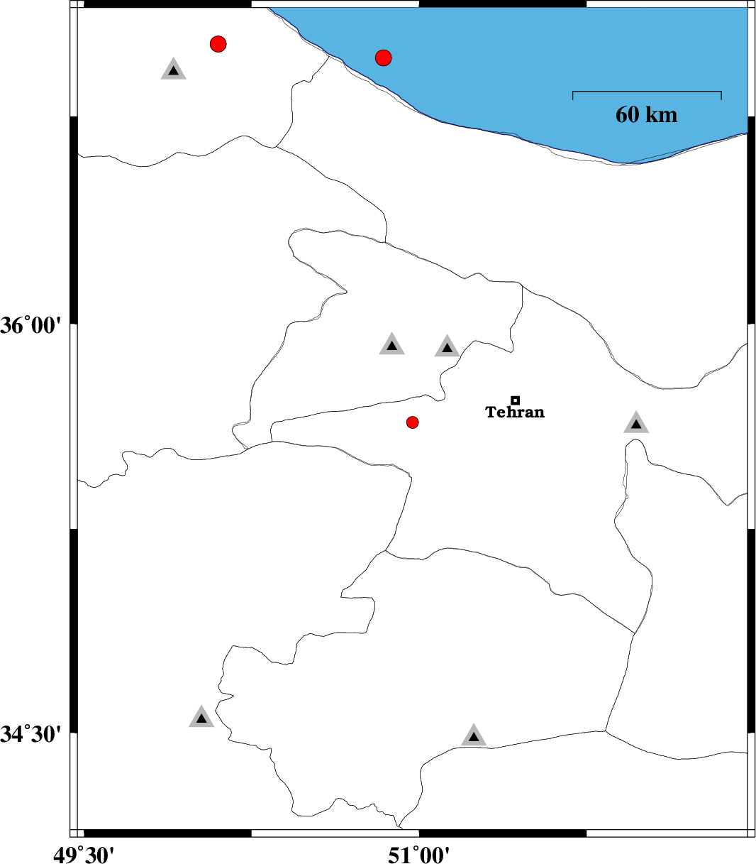 | 2011/07/08 | 07:21:27.4 | 11:51:27.4 | 36.96 | 50.84 | 7 | ML:3.3 | Caspian Sea, 17 km North of Tonekabon |
