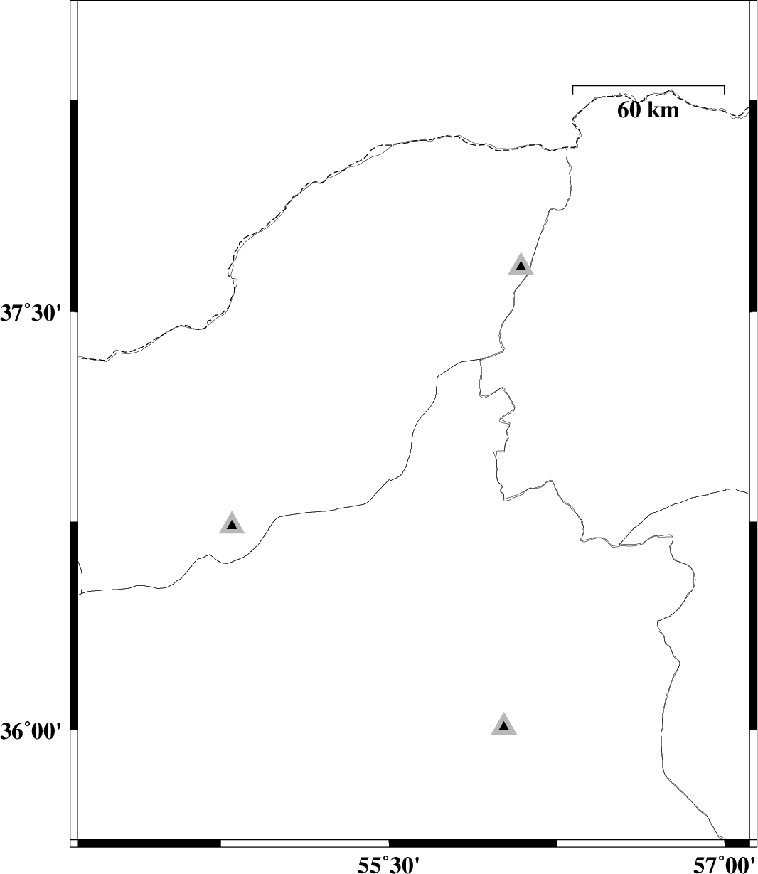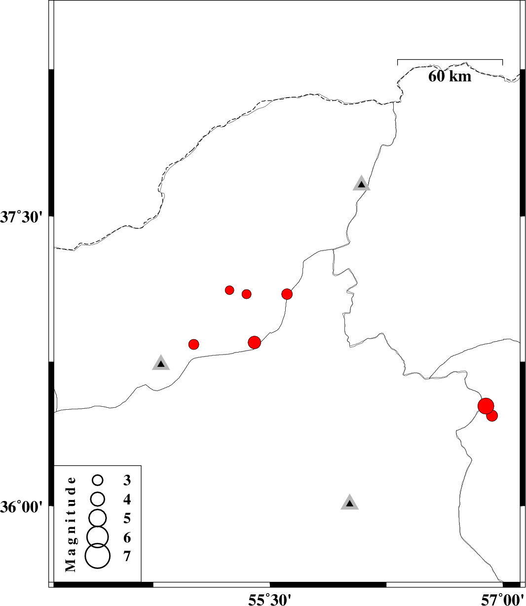| 2011/07/23 | 04:09:40.0 | 08:39:40.0 | 36.85 | 55.4 | 6 | ML:3.6 | Golestan Province, 43 km South of Minodasht | ||