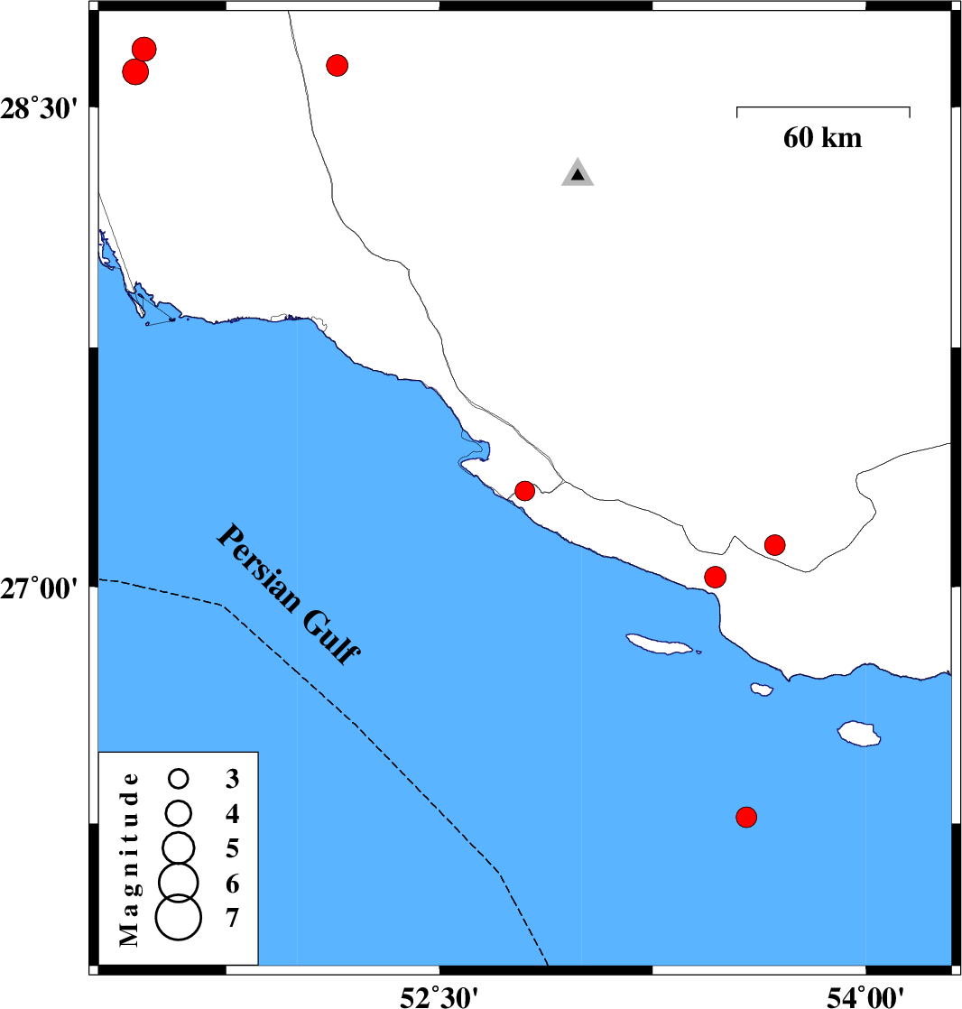 | 2011/07/02 | 01:10:40.2 | 05:40:40.2 | 28.68 | 51.46 | 30 | ML:3.8 | Bushehr Province, 9 km Khormog | ||