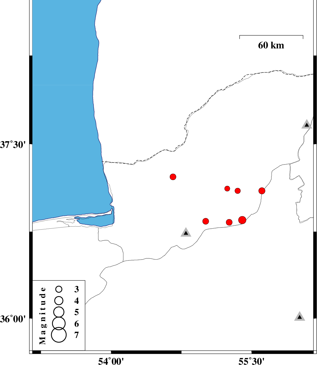 | 2011/07/23 | 04:09:40.0 | 08:39:40.0 | 36.85 | 55.4 | 6 | ML:3.6 | Golestan Province, 43 km South of Minodasht | ||