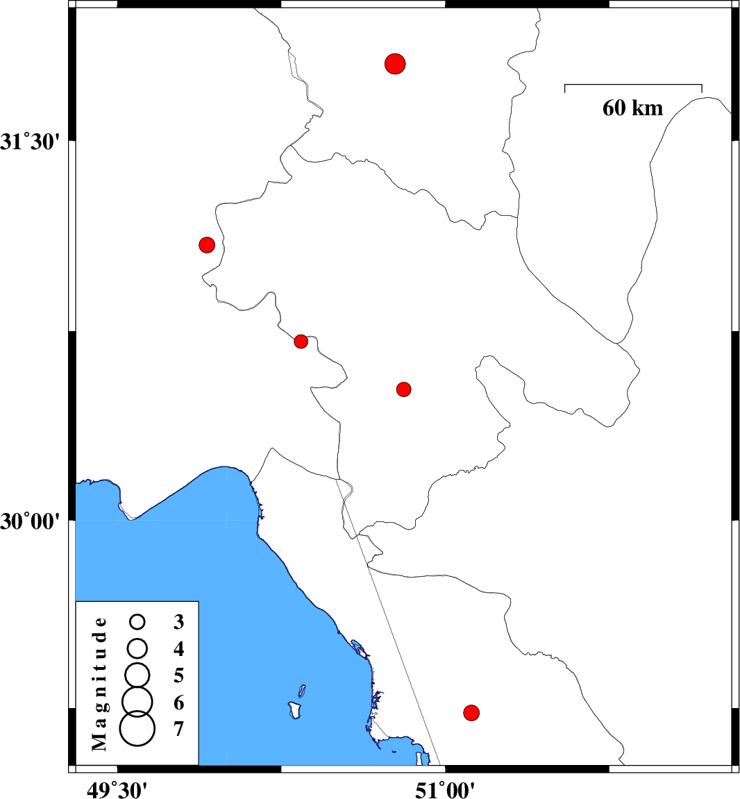 | 2011/08/04 | 01:54:37.6 | 06:24:37.6 | 31.09 | 49.91 | 14 | ML:3.2 | Khoozestan Province, 47 km South of Bagh Malek | ||