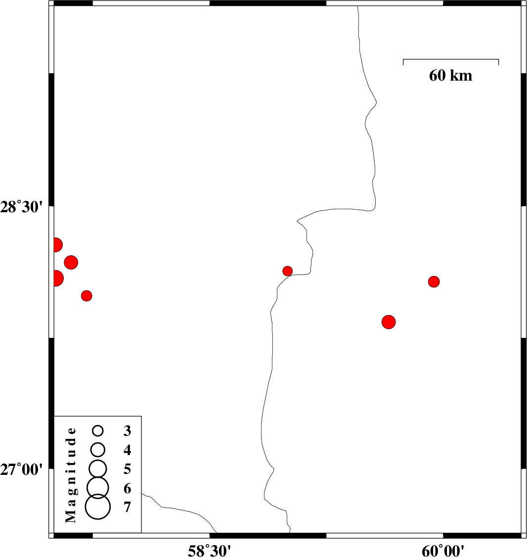 | 2011/07/10 | 19:04:47.5 | 23:34:47.5 | 27.84 | 59.65 | 16 | ML:4 | Sistan va Baloochestan Province, 125 km North-West of Iranshahr |