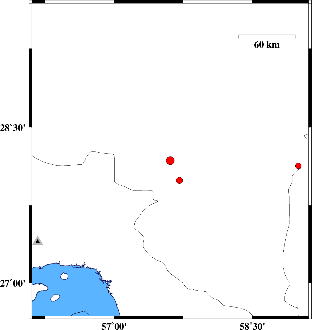 | 2011/08/09 | 19:25:10.0 | 23:55:10.0 | 28.18 | 57.61 | 14 | ML:3.9 | Kerman Province, 27 km North of Kahnuj | ||