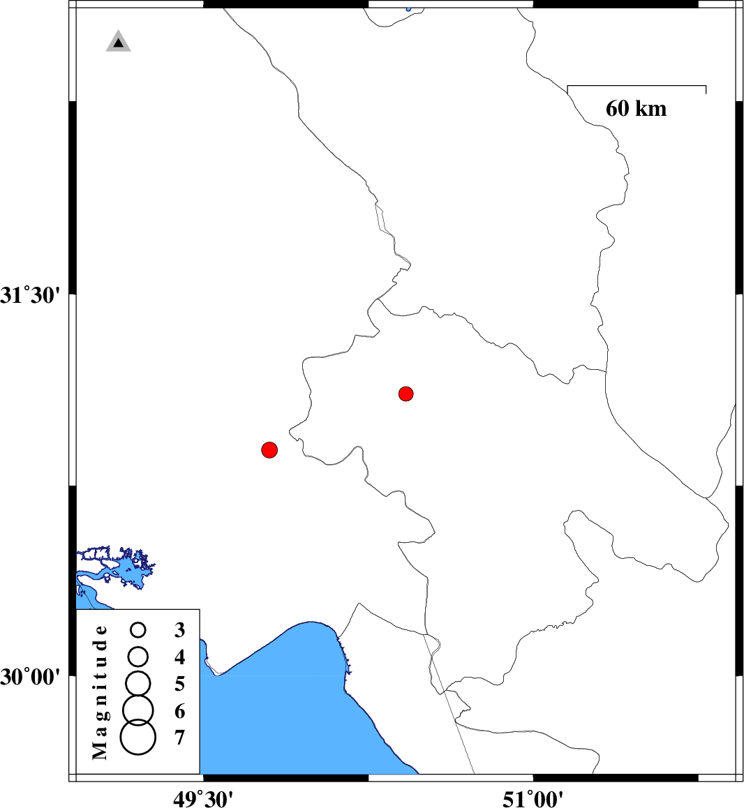 | 2011/08/07 | 08:31:16.3 | 13:01:16.3 | 30.89 | 49.8 | 30 | ML:3.3 | Khoozestan Province, 17 km North of Omidiyeh |